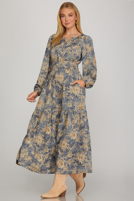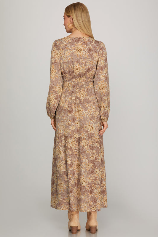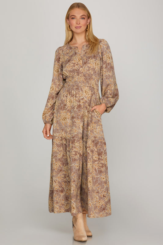 Boho Fall Abstract Floral Long Sleeve Maxi Dress