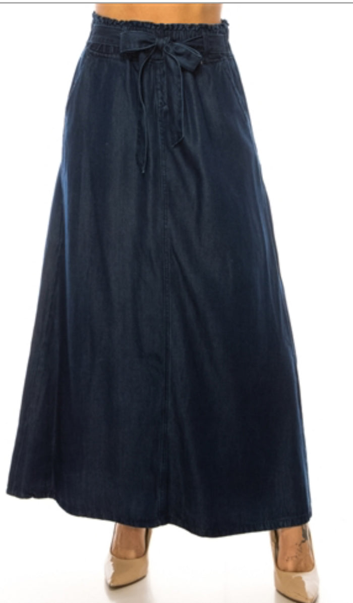 Introducing the stylish Be-Girl Elastic Sack Waist Style Maxi Skirt now available in PLUS SIZES! This denim long skirt features a comfortable elastic waistband with a trendy paper-sack style and a coordinating tie belt. Its functional side pockets add convenience and the maxi length gives a flattering look. Available in Dark Wash from the