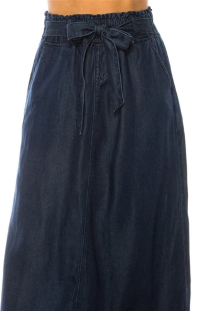 the stylish Be-Girl Elastic Sack Waist Style Maxi Skirt! This denim long skirt features a comfortable elastic waistband with a trendy paper-sack style and a coordinating tie belt. Its functional side pockets add convenience and the maxi length gives a flattering look. Available in Dark Wash from the