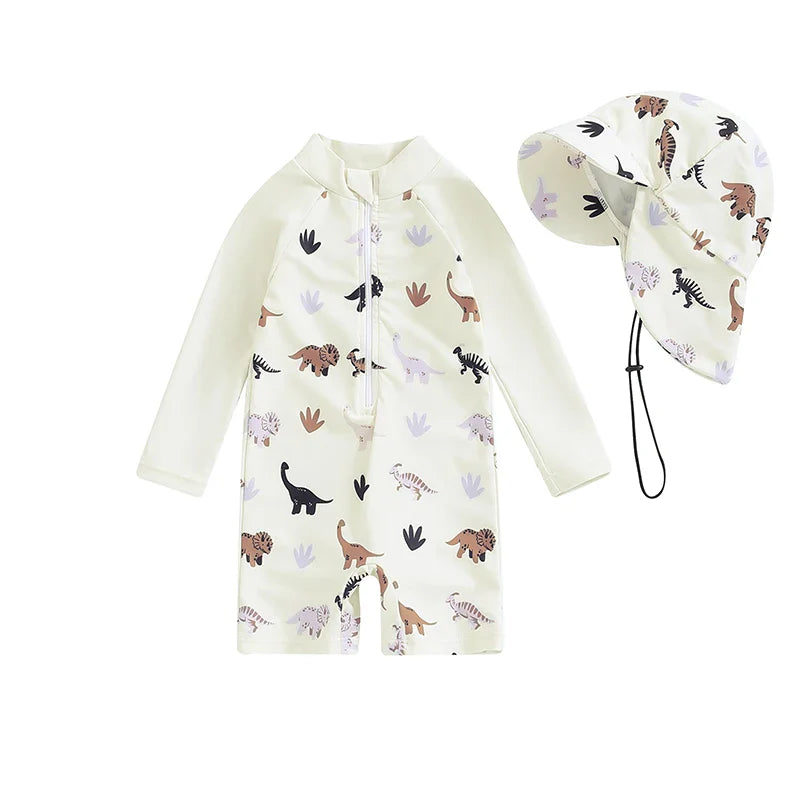 Baby Toddler Boy 2Pcs Swimwear Set Dinosaurs / Turtle / Whale Print Long Sleeve Swimsuit Sun Hat Bathing Suit Outfit Set