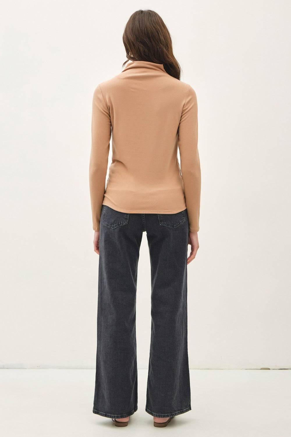 The Mock Neck Long Sleeve T-Shirt is a versatile and modern essential for any wardrobe. Featuring a stylish mock neck design and long sleeves, this t-shirt offers a chic and sophisticated look that can be easily dressed up or down. The soft and stretchy fabric provides a comfortable and flattering fit, making it a go-to piece for layering or wearing on its own. Whether paired with jeans for a casual ensemble or styled with trousers for a more polished outfit, this mock neck long sleeve t-shirt is a versatile and stylish option that effortlessly transitions from day to night. Add this piece to your collection for a touch of elevated simplicity in your everyday looks.