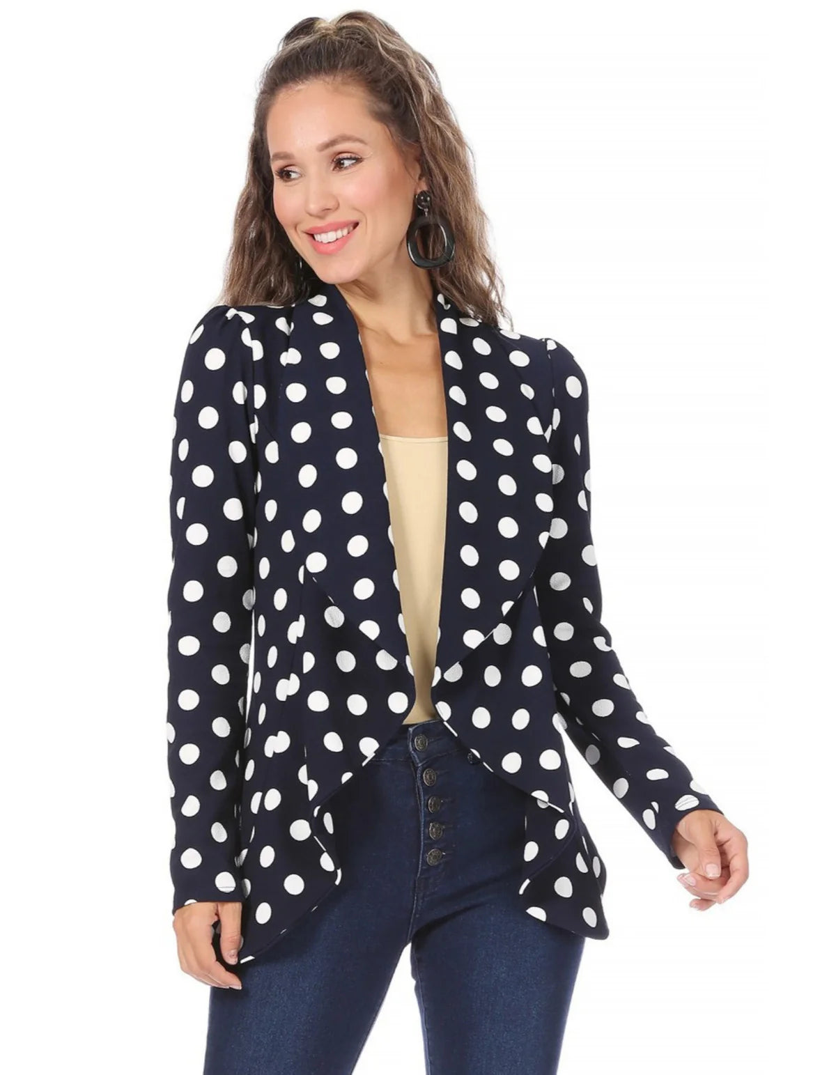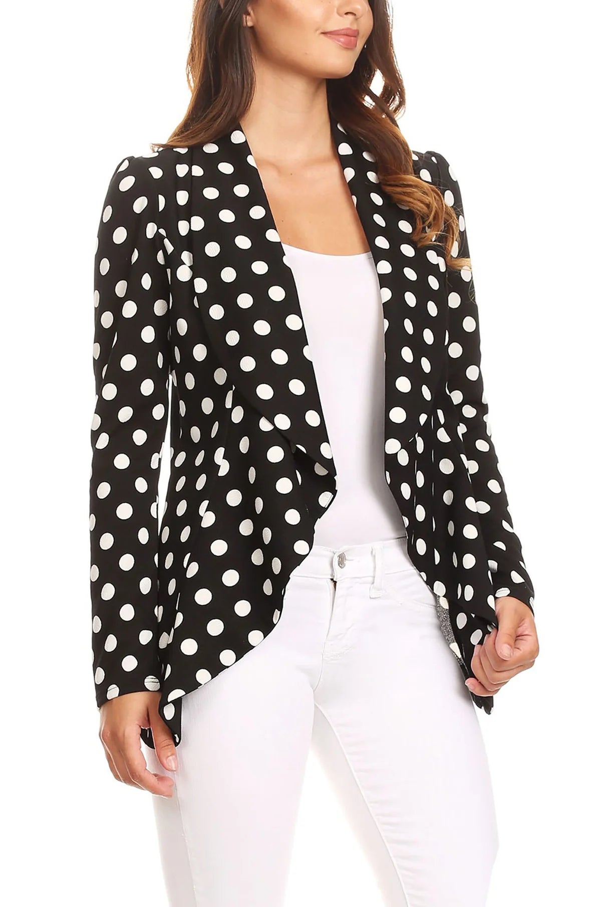 Stay fashionable with this polka dot, waist-length blazer. It features a loose fit, draped open front, and asymmetric hem for a trendy look.