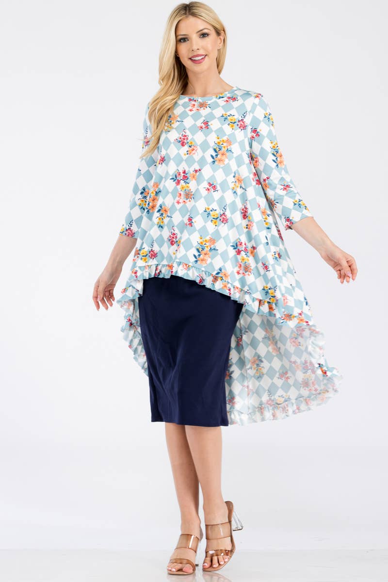 Floral Checkered Tunic Top with Ruffle Hemline