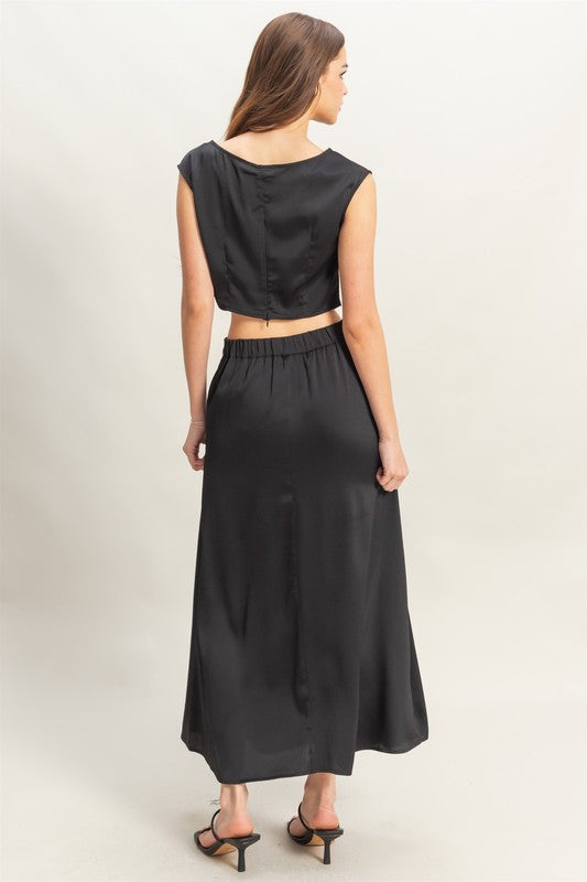 This matching set is designed to keep you looking effortlessly stylish. The sleeveless top features a flattering boat neckline and a relaxed fit with a cropped hem, perfect for warm days. The coordinating maxi skirt sits high on the waist with a banded detail and flows gracefully to the floor, creating a comfortable yet elegant silhouette. Pair this set with a blazer or cardigan for a polished look. Made from a soft blend of polyester and spandex, this set moves with you while maintaining its shape. Ideal for any occasion, it brings a cheerful and confident vibe to your wardrobe.