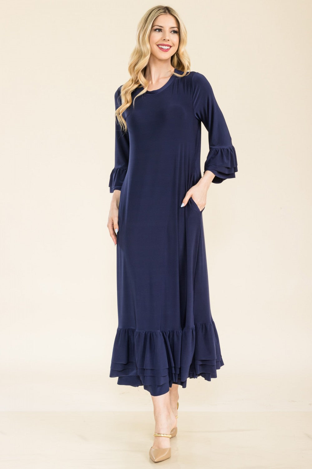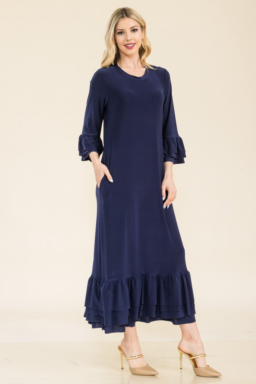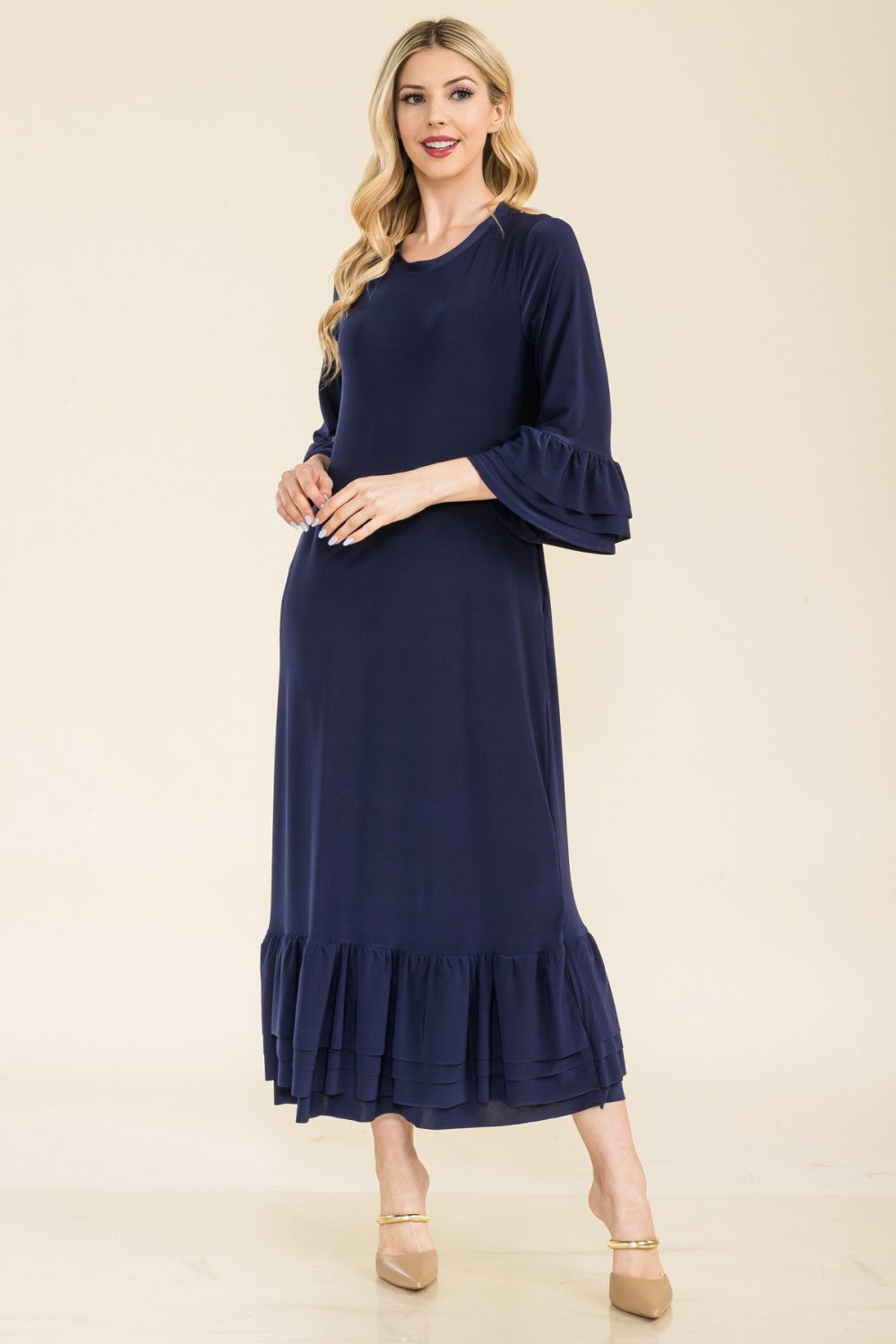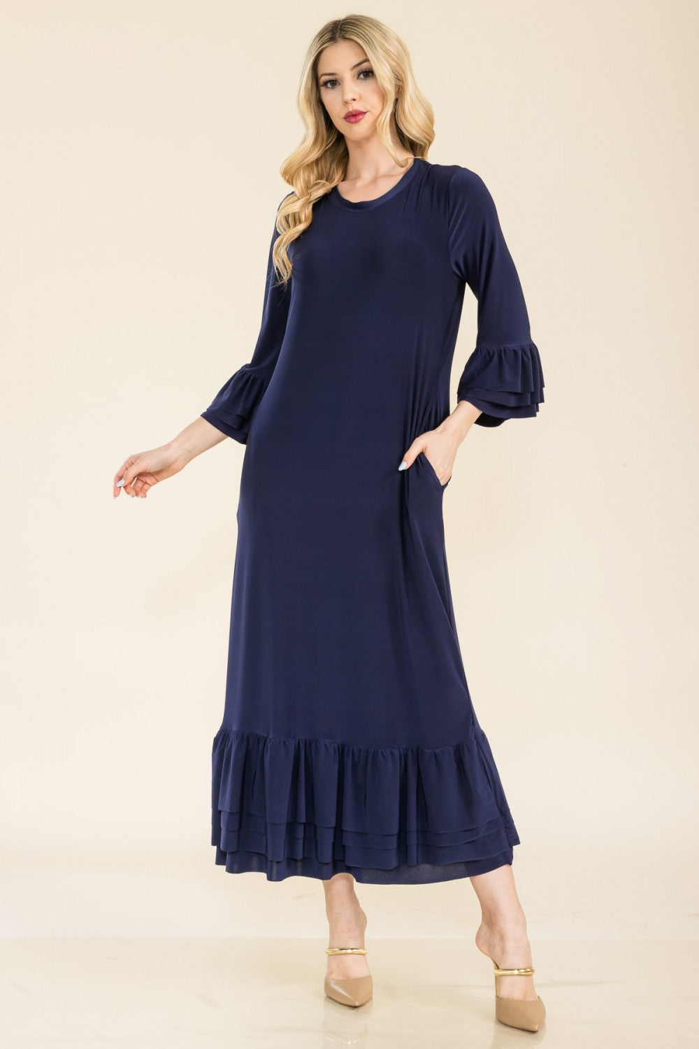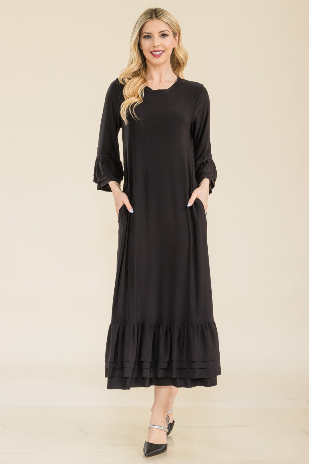 | -Modest Midi dress -Classic solid colors available -3/4 layered ruffle bell sleeves -Elegant tiered ruffle hemline -Perfect for church, or any special gathering. -Made from the softest Fabric -This dress will keep you looking elegant -Model is 5"8 ft and wearing a size Small -Actual colors may vary slightly due to differences in lighting and monitors |