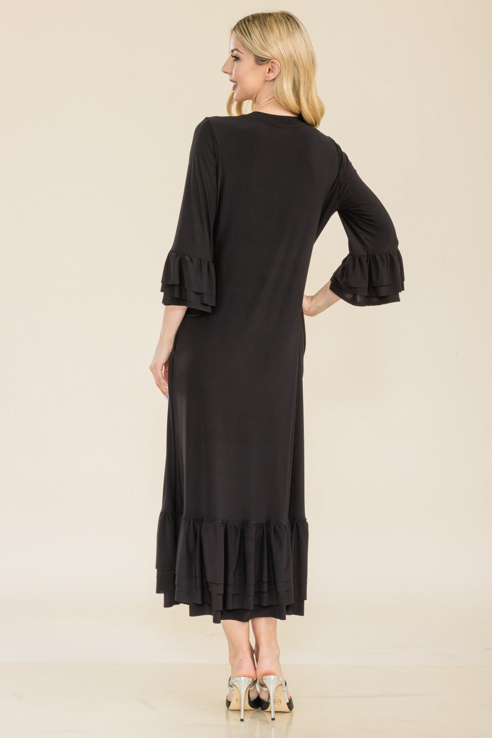 This Midi dress offers both modesty and elegance, with classic solid colors to choose from. Its 3/4 layered ruffle bell sleeves and tiered ruffle hemline add a touch of sophistication. Made from the softest fabric, this dress is perfect for any special gathering, including church. Stay stylish and comfortable in this stunning piece.