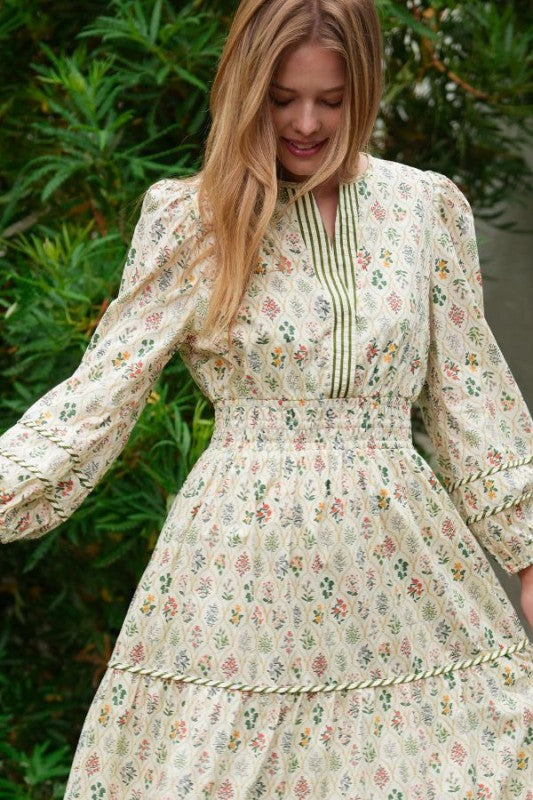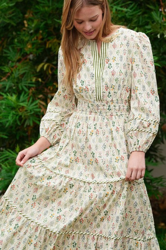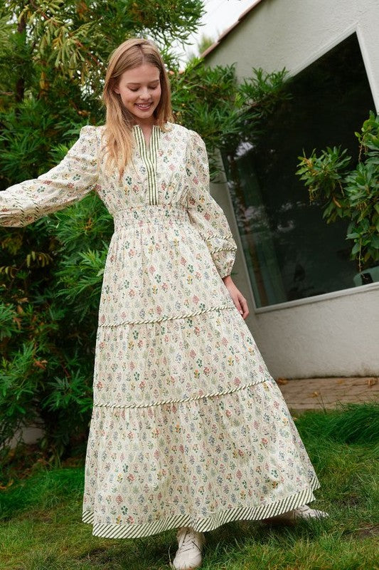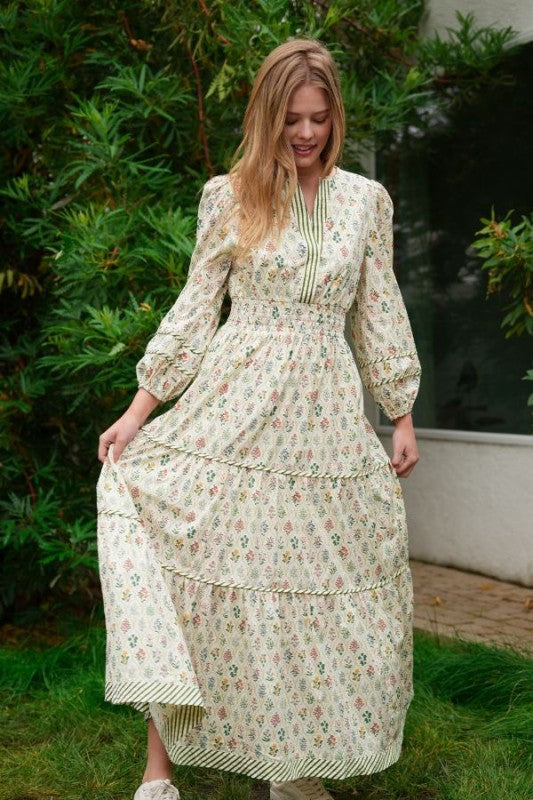 This delightful maxi dress combines a vibrant cotton print with a stylish stripe print trim for a fresh, lively look. Lined for comfort and featuring long sleeves, it offers both coverage and breathability. The elastic waist ensures a flattering silhouette, while convenient side pockets add practicality. Perfect for brightening your day with cheerful style and ease.