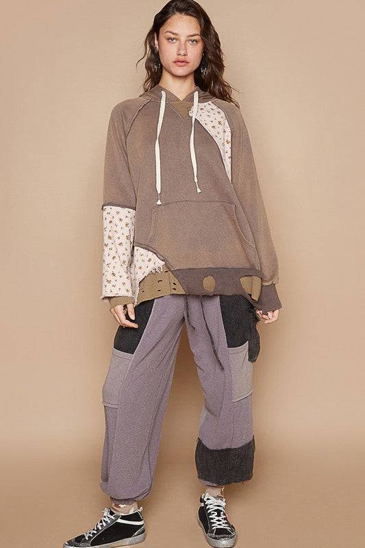 POL Floral Patchwork Distressed Drawstring Hoodie