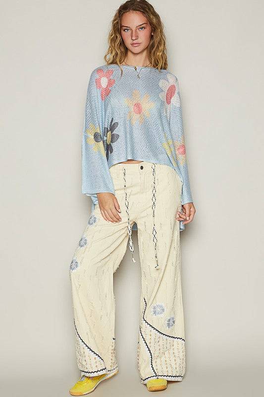 POL Flower Dropped Shoulder Long Sleeve Knit Top