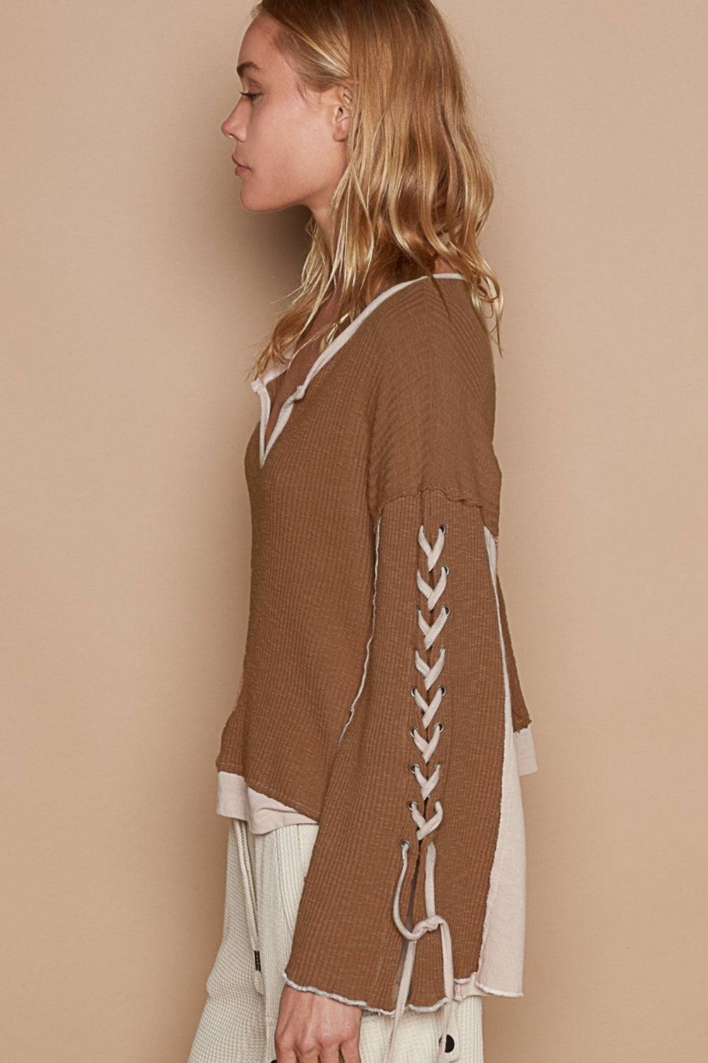 POL Lace-Up Sleeve Color Block Ribbed Knit Top