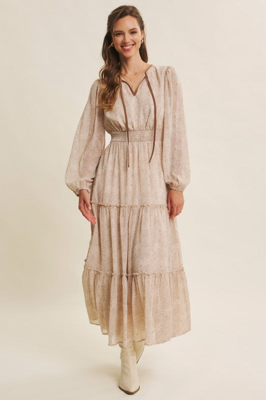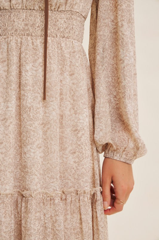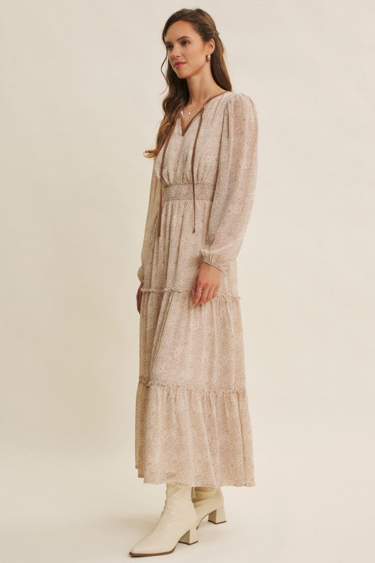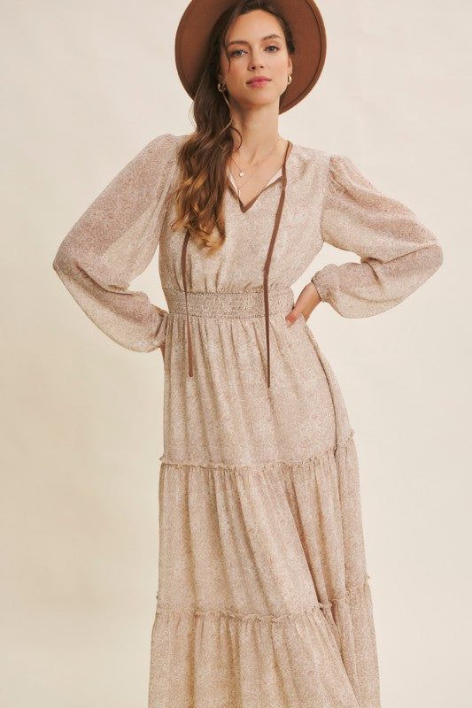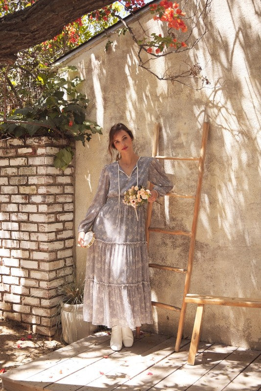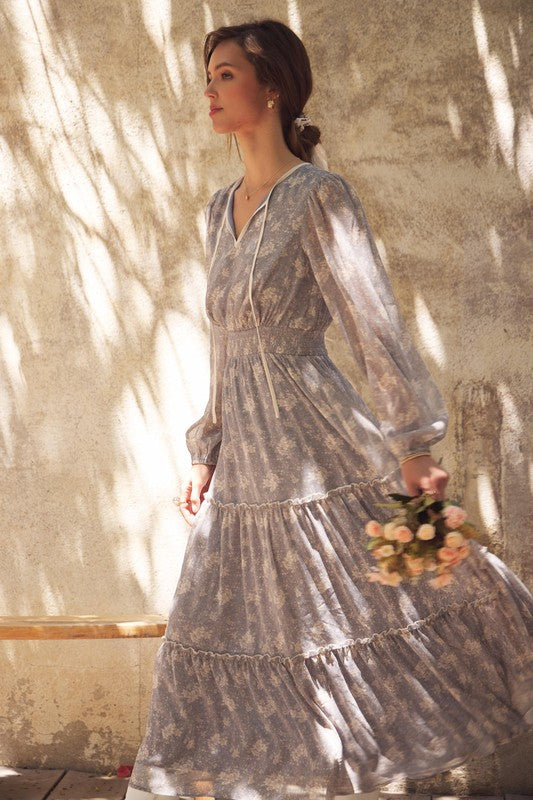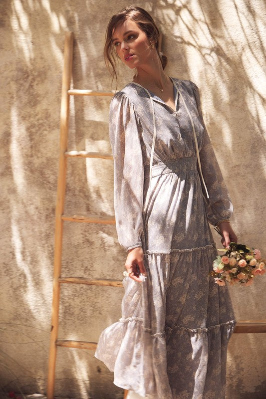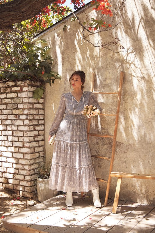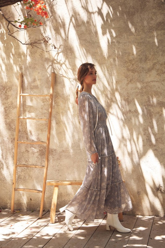 Turn heads with this romantic floral maxi dress, crafted in a delicate sheer fabric that flows beautifully. Featuring a round split neckline with a contrast neck tie, it offers an effortlessly chic look. The balloon sleeves add volume and elegance, while the smocked waist flatters the figure for a comfortable, feminine silhouette. Finished with tiered ruffles for graceful movement, this dress is perfect for the transitional season, resort wear collections, or boho-chic wardrobes. A must-have bestseller style to add elevated everyday pieces with timeless appeal. Features - Long balloon sleeves - Maxi dress - Romantic floral print - Delicate sheer fabric - Tiered ruffles - Round split neck - Smocked waist - Contrast neck tie - Lined Contents - SELF, CONTRAST, LINING: 100% POLYESTER Size + Fit Model is 5'9.5" and wearing a size Small. Please refer to our size chart.