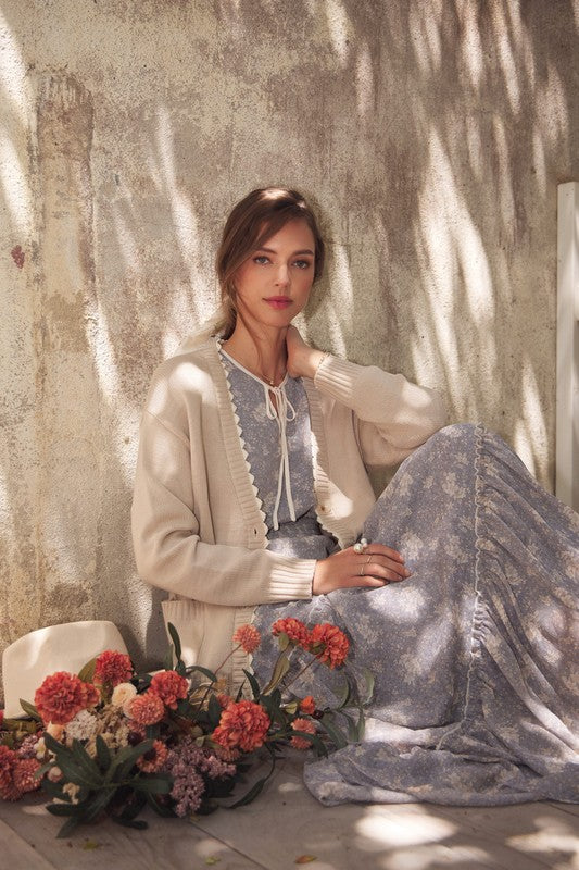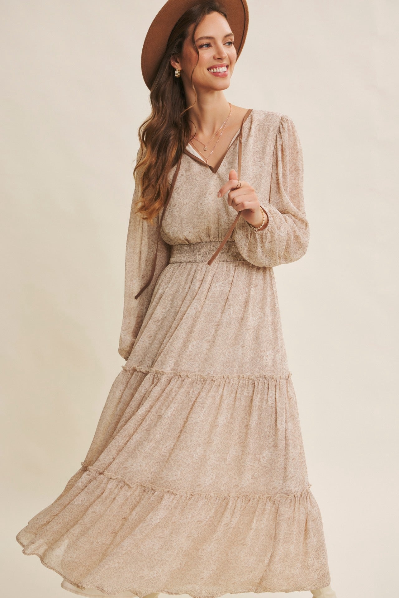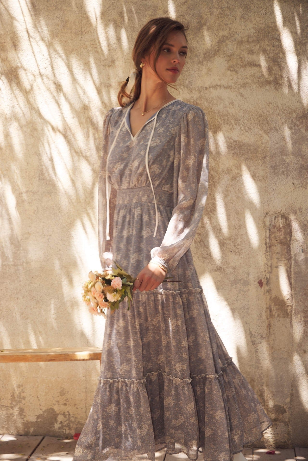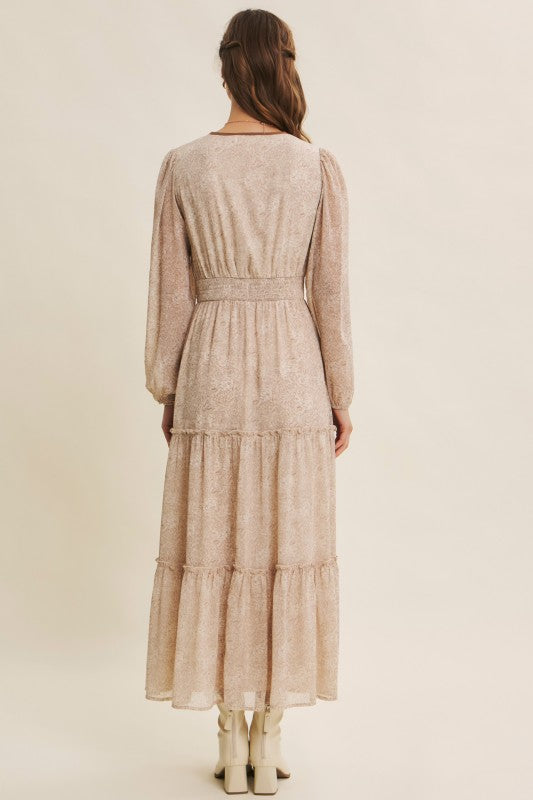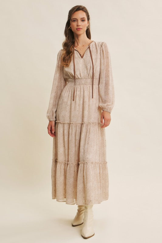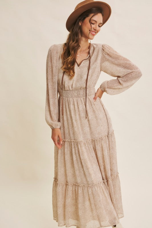 Turn heads with this romantic floral maxi dress, crafted in a delicate sheer fabric that flows beautifully. Featuring a round split neckline with a contrast neck tie, it offers an effortlessly chic look. The balloon sleeves add volume and elegance, while the smocked waist flatters the figure for a comfortable, feminine silhouette. Finished with tiered ruffles for graceful movement, this dress is perfect for the transitional season, resort wear collections, or boho-chic wardrobes. A must-have bestseller style to add elevated everyday pieces with timeless appeal. Features - Long balloon sleeves - Maxi dress - Romantic floral print - Delicate sheer fabric - Tiered ruffles - Round split neck - Smocked waist - Contrast neck tie - Lined Contents - SELF, CONTRAST, LINING: 100% POLYESTER Size + Fit Model is 5'9.5" and wearing a size Small. Please refer to our size chart.