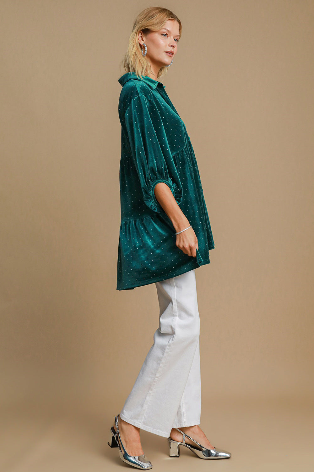 Umgee Full Size Polka Dot Collared Neck Button Up Shirt