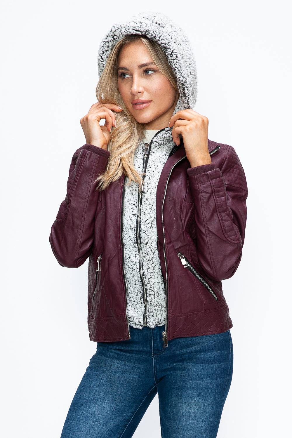 YMI Faux Layered Double-Zipper Jacket with Fuzzy Hood